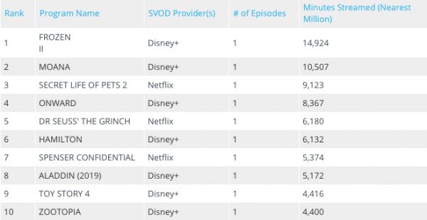 根据尼尔森(Nielsen)的最新数据,2020年用户在流媒体上花费时间最多的前十部电影中,Disney+占到七部,榜单前两位是著名的迪士尼动画《冰雪奇缘2》和《海洋奇缘》。虽然Netflix一直在投资儿童内容,但和迪士尼相比仍处下风。