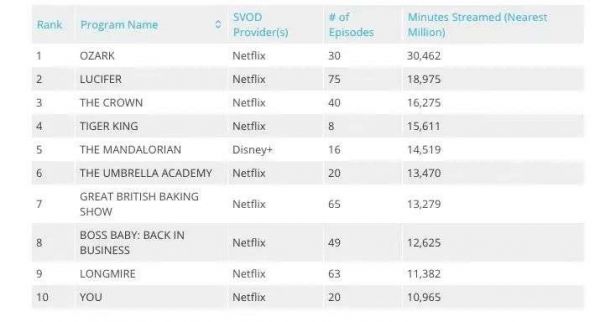 这些变化推动了迪士尼加大原创剧集投入力度,这是Disney+目前和Netflix最大的差距所在。在尼尔森统计的2020年榜单中,用户观看时长排名前十的剧集中,有9部来自Netflix。