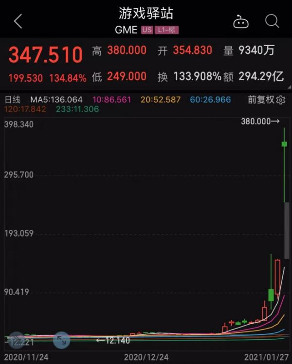 1月28日游戏驿站截止收盘涨幅134.84%每股收347.510美元,愤怒的散户大胜。
