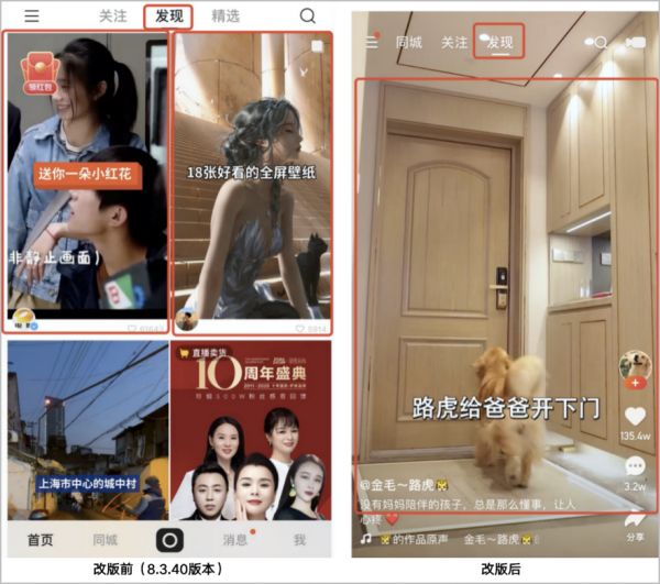 2020年9月的改版升级当中,快手一改此前的克制,牺牲掉了自身一定的社交属性,将发现页的“双列信息流”改为了“上滑下滑”,可以提高广告的转化效率。