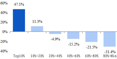 回报差异的背后,同一个科创板,不同的世界。兴业证券研报显示,2020年11月至2021年1月,科创板上涨幅最好的10%公司平均大涨了47%。但除了这10%的头部公司之外,大多数公司的股价表现却难以令人满意,约80%的公司股价是下跌的,表现最差的20%公司股价平均下跌了31.4%。