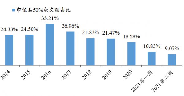 根据东北证券的研究,2020年之后,A股市值后50%的公司成交额占总成交额的比重显著下降,到2021年已经不足10%,创下历史新低。