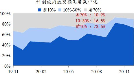 科创板的趋势更加明显。2019年开板以来,科创板的交易额迅速向少数头部公司集中。兴业证券研报显示,在2019年11月,科创板前10%的公司成交额占科创板总交易额的比重约为40%,而到2020年11月达到了72.6%,这一比例是各大板块中最高的。创业板的数字也不低,目前前10%的公司成交额占比为50.8%。
