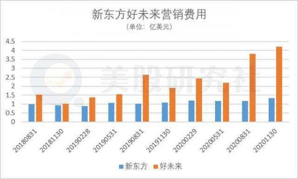 对比新东方与好未来的营销费用来看,重视发展线上的好未来在该支出上不断攀升。最新财报来看,三季度好未来在营销上的费用从去年同期的1.9亿美元,上升到了4.2亿美元,同比增长120%。