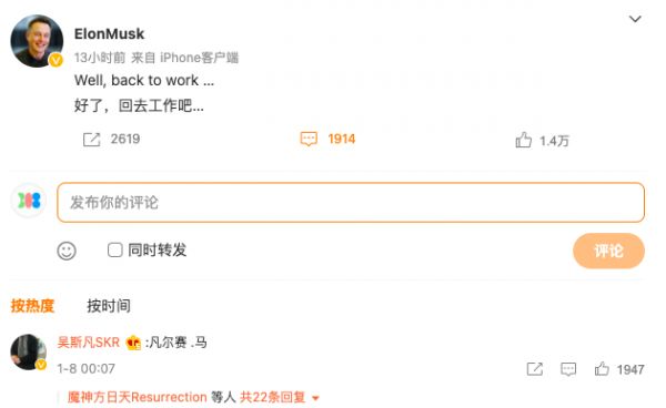 马斯克在得知自己成功登上世界首富的宝座后,在推特和微博都发出这段极具"凡尔赛文学"色彩的文字。细品之下,看似风淡云轻,实则并不淡定,不然为什么还要用中文秀一次呢?