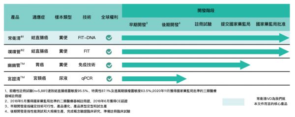结直肠癌筛查产品噗噗管为中国首个获国家药监局批准用于结直肠癌筛查的自检FIT筛查产品,用于测试与结直肠癌相关的血红蛋白生物标记。根据弗若斯特沙利文分析,就销量及销售收入而言,该产品为2019年中国最畅销的自检FIT筛查产品。