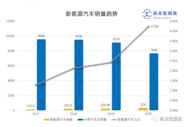 从需求端的角度看缺“芯”事件,受影响最大的是年销售量百万甚至千万辆级的传统车企,但对新能源汽车产量影响似乎却没那么严重。一个重要的原因是需求量并没有那么大,IHS Markit的数据显示,2020年全球汽车销量约为7650万辆年,而全球新能源汽车销量则为324万辆,这一数字占全球汽车总销量的比重只有4.23%。