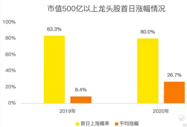 燃财经查阅了2019-2020年港股首发市值在500亿港元以上的龙头股,一共15家,上市首日涨幅为正的概率为80%,2020年平均涨幅高达26.7%,这也终于解释了为什么如江海一类投资者热衷于通过打新来投资了。