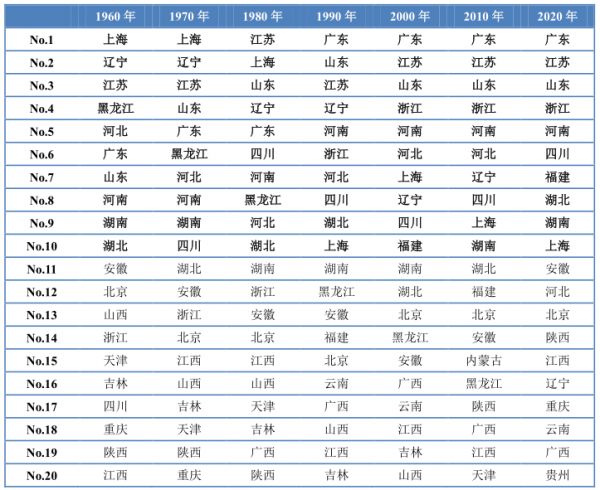 可是,仅对比2020年和2019年似乎有些不解渴。于是,我仔细查阅了1960~2020年的各省市GDP数据,并基于此做了一张表格,用以表征全国各省市经济总量20强的变化情况。