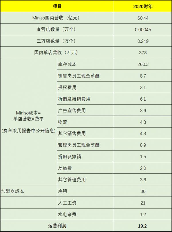 然后扣除名创优品和加盟商的成本:名创优品的成本按单店营收乘费率,费率取自报表。加盟商按三线城市计算日常租金、人工成本。