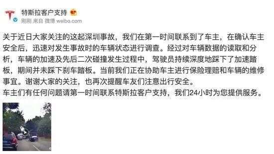 3日后,针对该事故,特斯拉客户支持在其官方微博上回应称,经过对车辆数据的读取和分析,车辆的加速及先后二次碰撞发生过程中,驾驶员持续深度地踩下了加速踏板,期间并未踩下刹车踏板。当前特斯拉正在协助车主进行保险理赔和车辆的维修事宜。