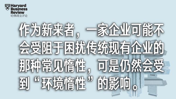 作为新来者,一家企业可能不会受阻于困扰着传统现有企业的那种常见惰性,可是我们的研究表明,它可能仍然会受到“环境惰性”的影响——即,企业之外的因素(比如供应商),这些因素制约了企业的行动,并迫使其遵守行业的传统惯例。
