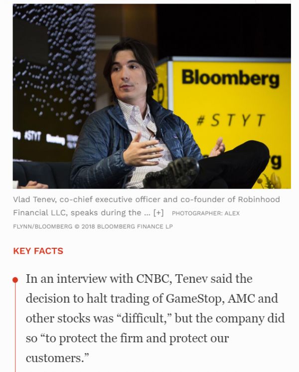 券商真正停止GME买入交易的原因,散户券商Robinhood的CEO已经说了,是为了保护散户本身和Robinhood。