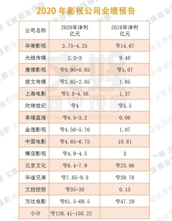就在1月末,随着各大影视公司2020年业绩预告的出炉,受疫情影响比较大的影视公司们集体交出了一份令人惊异的成绩单:万达电影预亏61.5-69.5亿元、文投控股预亏30-35亿元、华谊兄弟连续三年亏损……