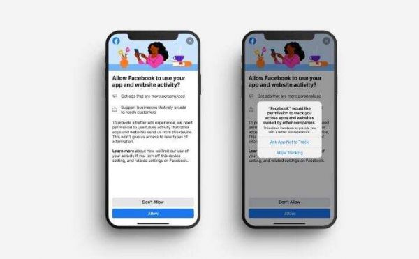 在Facebook测试的一条弹出消息中,手机上有一张微笑的女人图片,旁边是一杯茶和一瓶鲜花,请求用户允许他们的“应用程序和网站活动”用于“支持企业”和“获得更加个性化的广告”。然而,在用户回应第一个弹出窗口后,苹果发出了另一个弹出窗口,上面写道:“Facebook希望获准在其他公司拥有的应用和网站上跟踪你。”随后出现了两个选项:“要求App不要跟踪”和“允许跟踪”。