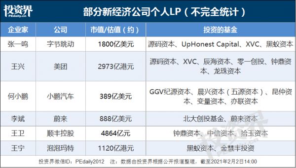 其中,股权投资是新贵们十分青睐的方向之一。投资界此前曾报道,包括张一鸣、王兴、何小鹏等在内的多个新经济独角兽/巨头掌门人,都在悄悄成为GP背后的“金主爸爸”。