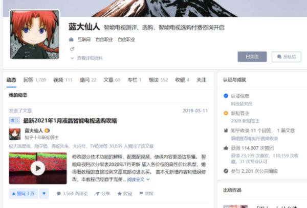 比如,典型案例,知乎的“蓝大仙人”,就专攻智能电视领域的专业博主,近两千篇回答文章都是专注智能电视测评选购的。内容对于全网都有辐射,他的一篇测评攻略可以带货5000多万元。