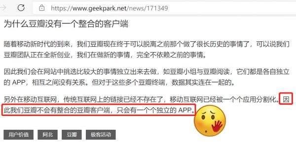 (附带一则豆瓣阿北在此之前 1 年说过的话:“我们豆瓣不会有整合的豆瓣客户端,只会有一个个独立的 APP。”)
