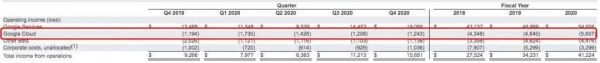 但是,谷歌云季度内运营亏损12.43亿美元,较上年同期11.94亿美元的亏损,有所扩大。2020全年,Google Cloud(谷歌云)运营亏损总计56.07亿美元,高于2018年43.48亿美元的运营亏损,以及2019年46.45亿美元的运营亏损。