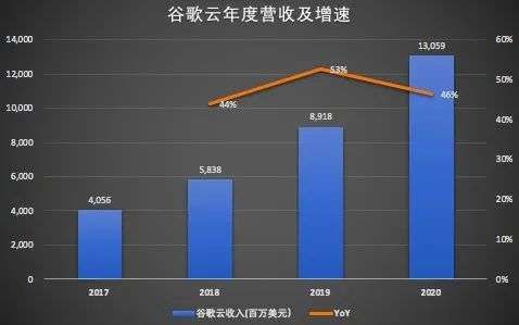 但是,对比谷歌云同比增速,谷歌云营收增速面临放缓的趋势。2020全年,谷歌云总收入130.59亿美元,同比增长46%。这一个增速低于2019全年53%的同比增速。