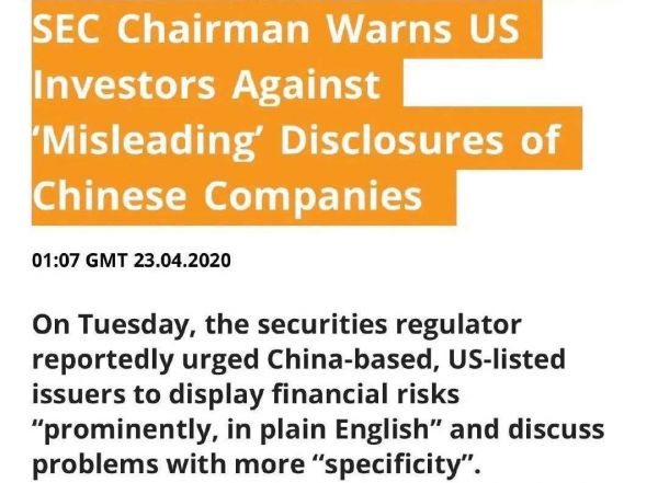 2020年4月,美国证券交易委员会主席杰伊·克莱顿以信息披露问题为借口,要求投资者不要购买在美国上市的中国企业的股票。