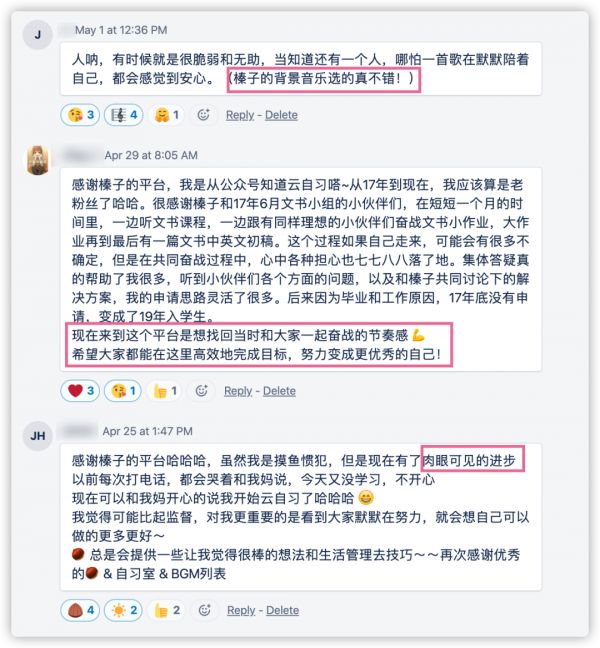 “学习主播的存在也很重要。”榛子说,“去年八月有一整个月我没有去自习室,没更新封面故事,更没有共享屏幕(放音乐)。那段时间的打卡人数非常惨淡。因为这些看似琐碎的小事,背景音乐也好,封面故事也好,emoji表情的回应也好...都是自习室的精神支柱。”
