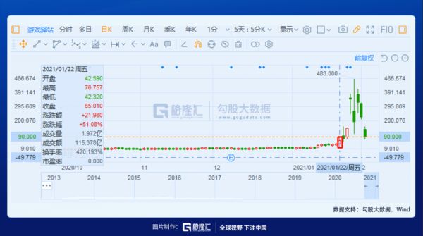2020年1月22日,香橼发推称GME只值20美元,散户们随后集体冲进股市。当天,GME成交量超过1.97亿股。截至收盘涨超51%,报65美元。由于波动性过大,该股一度触及熔断。这根阳线,是美国梦开始的地方。