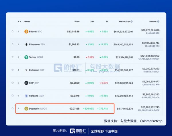 一开始,散户们集中力量进攻GME、AMC、黑莓等做空率高企的股票,很快取得了成效。但从1月29日开始,散户转战币圈,狗狗币单日暴涨800%,两日涨幅已超10倍,一度升至0.08美元以上。Coinmarketcap数据显示,DOGE市值已经跻身前七。