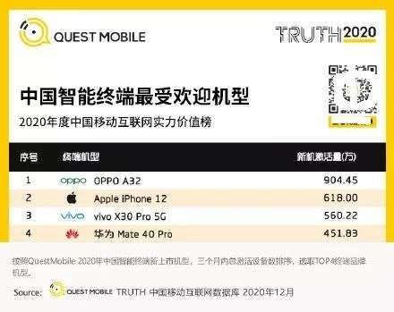 根据QURST MOBILE发布的《2020年12月中国智能终端最受欢迎机型》,目前5G手机激活量前四名中,第一是OPPO A32,激活量量904.45万;第二是iPhone 12,激活量618万;第三是vivo X30 Pro 5G,激活量560.22万:第四是华为Mate40 Pro,激活量451.83万。