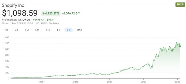 Shopify 过去5年股价变动,截图来自 Google Finance