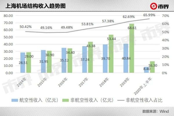 2017年以来,上海机场的非航空性收入始终高于航空性收入,到2020年上半年,占收入比重已经达到66%。