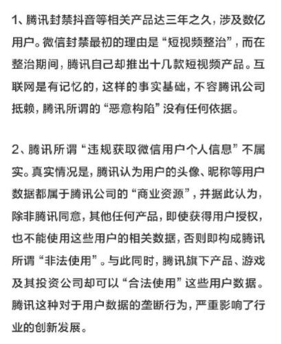 腾讯方迅速作出回应,认为字节跳动公司的相关指控“系恶意诬陷”,并表示字节跳动及相关公司还存在诸多侵害平台生态和用户权益的违法违规行为。腾讯方也将继续提起诉讼。