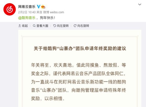 2月2日,云音乐官方微博发布长文,直接艾特酷狗音乐,“关于给酷狗‘山寨办’团队申请年终奖的建议”,给酷狗音乐拜了一个狗年。云音乐表示,酷狗音乐的“音乐推”功能,从播放器功能入口位置、推歌交互形式、设计样式等各方面抄袭了云音乐的“云贝推歌”功能。而更早之前,云音乐上线了“一起听”功能,酷狗音乐几个月后也上线了相似的“跟听”功能。