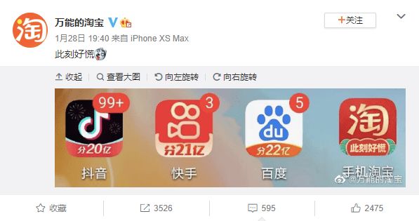 战场还未结束,网友又迅速发现了“第三战场”。抖音、快手、百度、淘宝就春节红包营销也开启了攻防战,抖音宣布春节投入20亿红包,快手则是21亿,百度追加到22亿,剩下的淘宝则宣布成为春晚的独家电商合作伙伴,在春晚期间发出至20亿红包。
