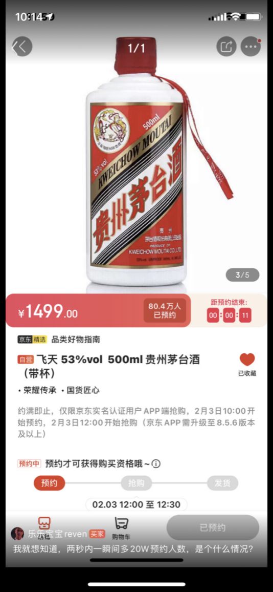 2月3日,有用户在京东平台留言称,“两秒内一瞬间多20万预约人数,是个什么情况?”据了解,当天抢购开始前十秒左右,预约人数已达80.4万人。