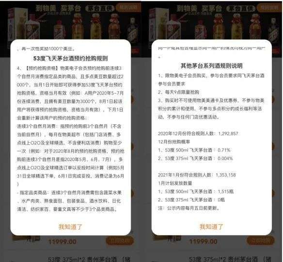 根据物美平台提供的数据,去年12月符合规则的人数约为129万人,53度500ml飞天茅台抢购率0.71%;今年1月份符合规则人数上升到了135万人,53度500ml飞天茅台计划发放数量仅有1515瓶,53度375ml飞天茅台0瓶。