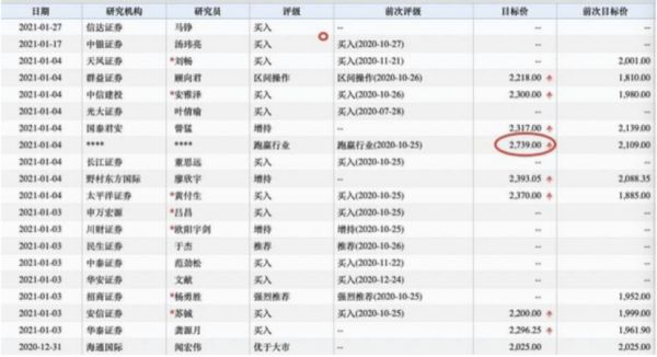 据澎湃报道,Wind统计显示,目前贵州茅台的投资评级最高目标价为2739元/股,该机构前次评级为2020年10月25日,目标价为2109元/股,但Wind未披露该机构名称,这也意味着贵州茅台的股价还有近20%的上涨空间。