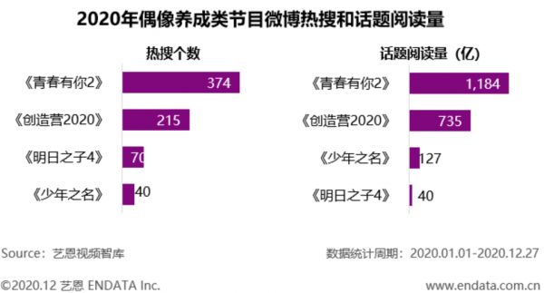 这种选择,与三年来选秀节目的播出热度、团体运营成果不无关系。原UNINE成员李振宁就曾在采访中表达过对R1SE的羡慕,鹅系的成团运营成为不少公司押宝《创4》的关键;而根据艺恩数据统计,2020年《青春有你》第二季的微博热搜和话题阅读均高于《创造营2020》,节目播出时的热度也是经纪公司考虑的一大因素——节目播出的热度和成团运营,似乎只能选择其中之一。