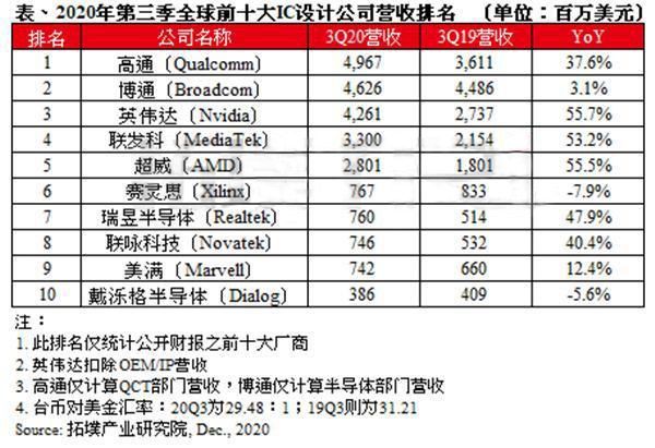 在芯片制造领域,IC设计厂商在其中担任的作用就是设计芯片。没有IC设计厂商的设计图纸,即使晶圆厂制造能力再强也造不出芯片。据拓墣产业研究院最新的数据显示在公布的《全球前十大IC设计公司营收排名》上,高通、博通和英伟达排名前三。