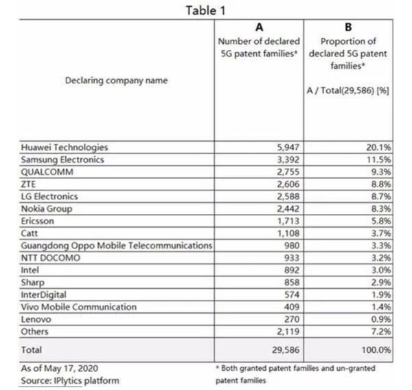 日本技术贸易株式会社(NGB Corporation)的分析报告显示:截至2020年5月17日,在5G关键专利方面,中国公司占比超过38%,其中华为以20.1%的占比排名全球第一。