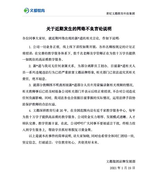 消息一出,引发众议。文都教育随即发布了《关于近期发生的网络不良言论说明》,其中提到,目前新文道相关人员一系列违规违法行为已经严重损害文都品牌形象,相关部门已依法追究其相关责任。