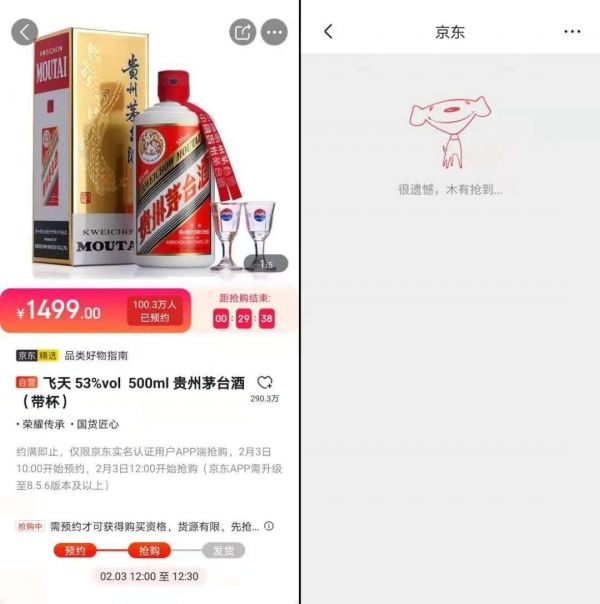 这个中午,她和同事们提前5分钟集中精神,再一次在京东平台抢购;意料之中,无人“中奖”。当天10点-12点期间,有100.3万人和她一样预约、摩拳擦掌。自2月1日起,在京东平台,所有实名注册的用户都可以预约抢购茅台了;无须PLUS会员门槛以后,预约购买基数猛增,从数十万预约增长至百万级。