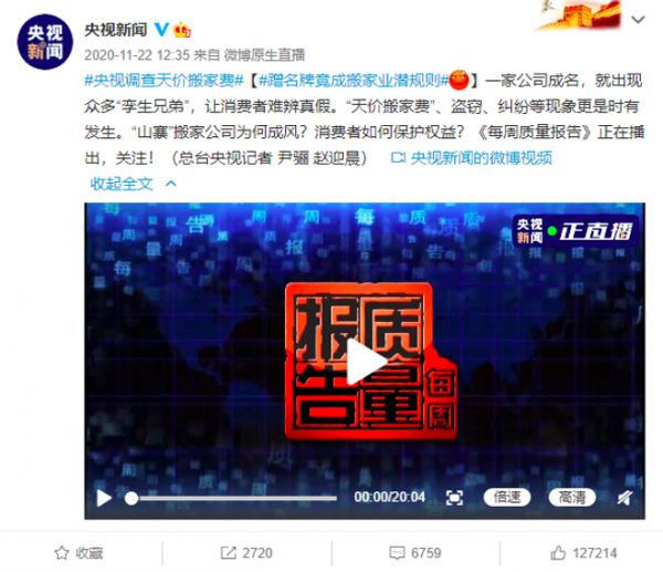 在2020年11月22日,央视新闻的《每周质量报告》就指出在搬家领域中,往往存在很多假借成名企业,欺骗消费者的事件发生,呼吁消费者们谨慎辨别品牌真假,打击这些不法企业。