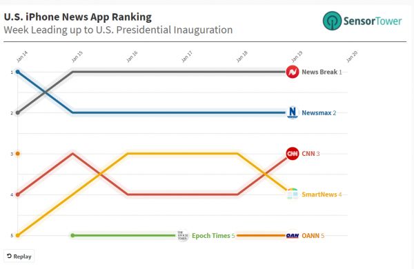 Sensor Tower数据显示,2020年,News Break在美国热门新闻应用中的下载量排名第一,在美国两家应用商店的下载量估计都达到了2370万次,现在News Break的每日活跃用户达到1200万。