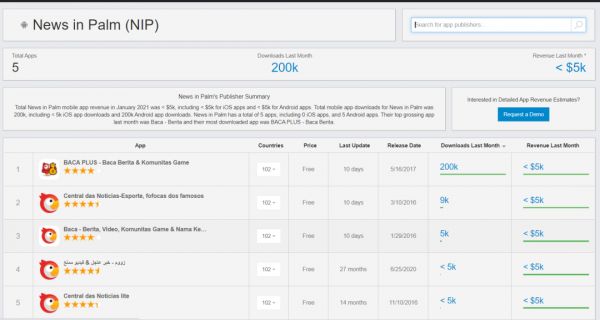 SensorTower数据显示,目前五洲万象旗下共有5款应用,其中包括2016年以来先后在印尼推出的Baca和BACA PLUS,同步在巴西上线Central das Notícias-Esporte和Central das Notícias lite,并于2020年6月在沙特上线了同款产品。但目前沙特版和巴西的其中一款产品均已超过一年以上没有更新。