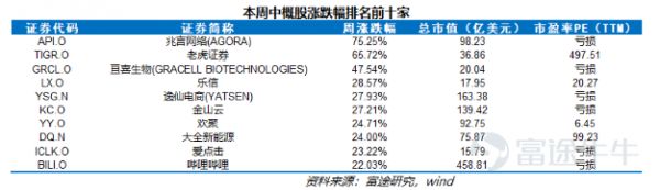 热门中概本周普涨:声望(兆言网络,API.O)上涨75.25%,乐信(LX.O)上涨28.57%,哔哩哔哩(BILI.O)上涨22.03%。