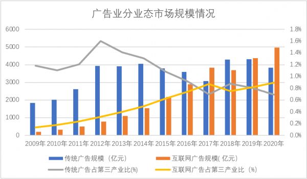 从宏观层面看,线上广告近年的持续膨胀,对实体经济的纾困边际效应不仅在持续缩小,且极有可能逐渐在增加实体经济负担,此外也可以预测,由于线上广告尚处于中等增长区间,在接下来势必会打破现今广告业对第三产业的占比区间,会实际上增加实体企业的市场费用支出压力。