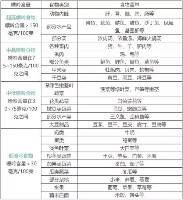 首先要减少高嘌呤食物的摄入,下面是一张各种食物嘌呤含量的图表,大家可以参考对照。