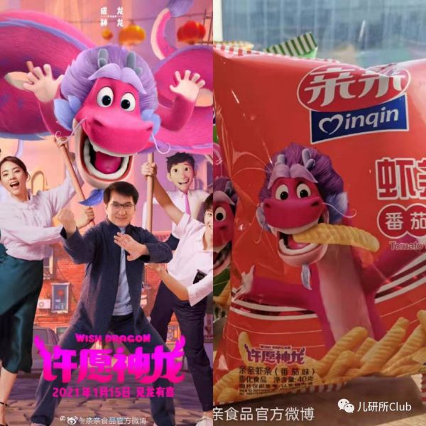据了解,亲亲食品和贺岁动画《许愿神龙》进行了深度的IP合作和营销。亲亲食品以亲亲虾条植入电影,并同期上市“许愿神龙”IP联名款虾条。