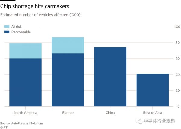 IHS Markit 2月3号表示,芯片短缺预计将导致全球汽车领域的产量比第一季度减少672,000辆。该预测公司预计短缺将持续到第三季度。追踪汽车生产的AutoForecast Solutions表示,由于短缺,到目前为止,全球已宣布停产,总计564,000辆汽车,估计今年的总影响可能为96.4万辆。据IHS称,中国将是受短缺影响最严重的国家,第一季度将有近25万辆汽车受到影响。